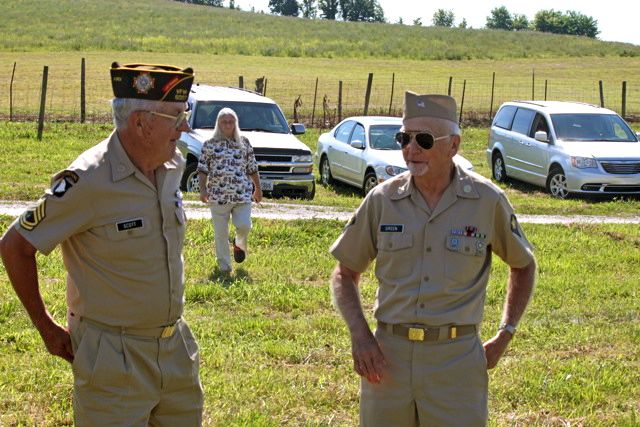 2012-06-23 - McKinney, Lincoln County, KY - Photo by Johnnie Tarter, Columbia, KY. Kenneth Scott, left and Charles Green of Columbia VFW Post 6097 chatted before the dedication of the Historical Marker commemorating the December 12, 1966 crash of the B-58 Hustler Bomber at a site near McKinney, in southern Lincoln County.