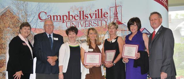 2012-06-22 - Campbellsville University, Campbellsville, KY - Photo by Christina L. Kern. CU photo. 2012 Excellence in Education recipients from Adair County were honored again at the Thursday, June 21, 2012 regular meeting of the Adair County Board of Education. This file photo was taken May 12, 2012, in Campbellsville and carried this caption: Adair County School System teachers, from left, receive Campbellsville University Excellence in Teaching Awards from Dr. Brenda Priddy, dean of the School of Education, far left,, and Dr. Frank Cheatham, vice president for academic affairs, far right. Teachers, beginning fourth from left, include: Alice Curry, Adair County Elementary School; Elizabeth Jane Reed, John Adair Intermediate School; and Robyn Lynn Mantooth, Adair County High School. Second from left is Darrell Treece, superintendent, and Sandra Wilson, assistant elementary school principal. - Joan C. McKinney, Campbellsville University