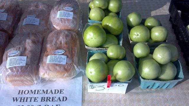 2012-06-22 - Adair Extension Office, 409 Fairground ST, Columbia, KY - Photo by Caitlin Helm. Caitlin Helm has four kinds of bread today: White, Wheat, Zucchini, and Lemon Bread. Her father, Darrell Bunnell of also of Coview Farms, Coburg, KY has the first tomatoes of the season. They are nice, big tomatoes - green ones - ready for a seasonally No. 1 Southern mainstay, Fried Green Tomatoes. The farmers market is open this Friday morning, June 22, 2012, from 6am-10pmCT.