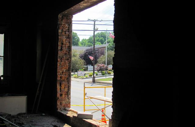 2012-06-19 - Downtown Columbia, KY - Photo by Ed Waggener. The deleted Firestone Building window offers a brief window to inspect the intricate masonry work of the solid brick wall in the historic building. The Red Nixon construction company is moving at a fast pace to transform the fire gutted structure into a state-of-the-art recording studio for Mr. Mike Harris and his partner, Danny Bailey. Mr. Nixon, known for great craftsmanship, is also known for getting things done. In no time - maybe not as brief a time as it took him to fire a 30 foot shot the first time he got his hands on the ball when Mr. Burr put him in the game as a substitute, that usually took just seconds - he'll have the building complete and it will be the center of pride in a revived downtown Columbia. And come to think of it - Red will have luck or the good fortune that those who prepare for it always do. He had it back then. As most recall, he almost always hit those 30 foot shots and was the hero of the game. -EW