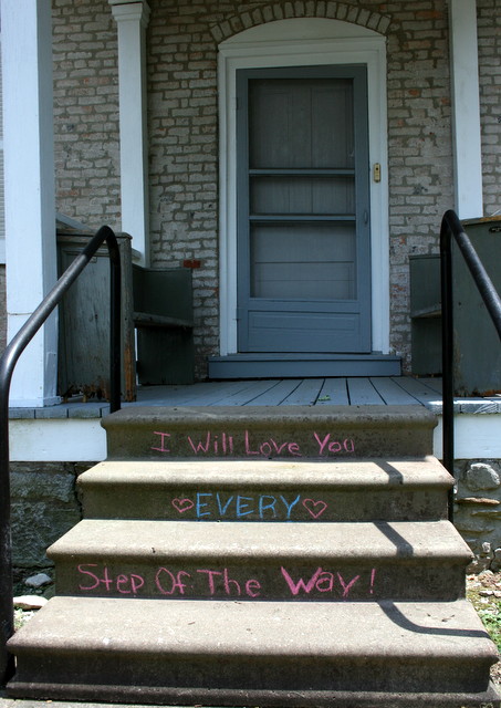 2012-06-19 - 201 Jamestown Street, Columbia, KY - Photo by Barbara Armitage. This message of love and devotion written on the Trabue House steps is all that remains of a recent wedding held in the Julia Miller Horton Memorial Rose Garden. Although it was meant for two unknown lovers the ladies of the Adair County Garden Club who maintain the gardens at the Trabue House find it comforting. Keeping the roses blooming through the blistering heat of our Kentucky summer is no easy task. Committed volunteers from the ACGC are hard at work every Tuesday morning making sure that the gardens are flourishing. If you are interested in holding your event at the Trabue House contact the Columbia Mayor's Office at 270-384-6183. -Barbara Armitage