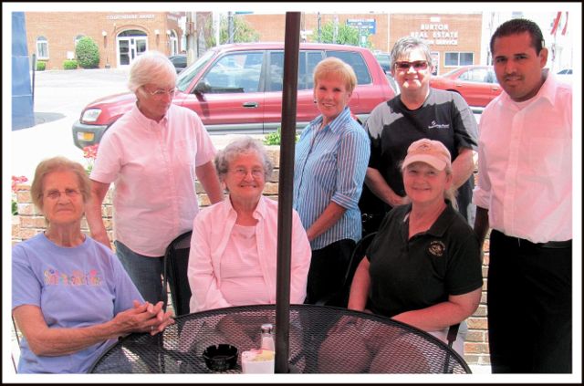 2012-06-19 - 104 Public Square, Columbia, KY - Photo by Ed Waggener. It was a surprising first, but it happened today. In their fifth year as volunteers beautifying downtown Columbia, today was the first time a local business showed appreciation for the transforming contribution the Adair County Garden Club has made. Today it happened, Antonio Aquino, far right, owner of Pablo's Mexican Grill, invited both regular maintenance crews, the Downtowners and the Trabue-House Gardeners, to lunch on the House at Pablo's Mexican Grill. Seated, from left are Lucille Lemmon, Mary Sharp, and Barbara Armitage. Standing, from left are Mary Knight, Jeanne Marshburn, and Maury Lewis.