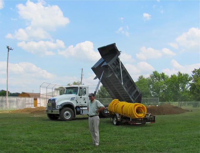 2012-06-19 - Jim Blair Park, 901 Hudson Street, Columbia, KY - Photo by Ed Waggener. Fence building and field grading are going on at the same time, as the regulation size softball field at Jim Blair Park nears completion. Ben Hayes, President of fence contractor Industrial, Inc., 148 Loveless Road, Russell Springs, KY. in the foreground has a crew putting the finishing touches on the fence. In the background, the tenth load of fill dirt from Burton Paving has been hauled by the Adair County Road Department to fill in a low spot on the infield which pooled water because of a poor grade. While the field is built to competition specs for softball tournaments, it will also be multi-purpose and will be used for baseball, as well. Terry Williams of the Adair County Road Department was driving the big Mack Dump truck.