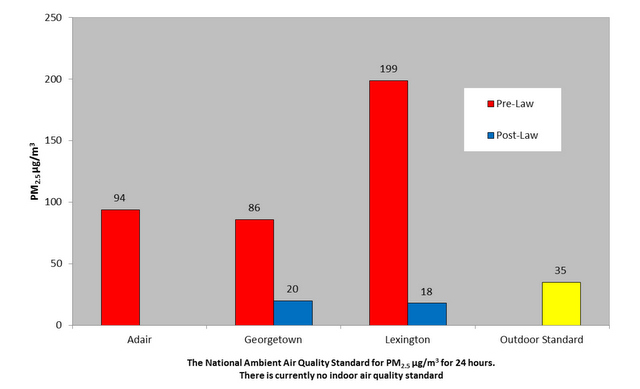 2012-06-18 - Somerset, KY - Photo from LCDHD. This chart shows what happens to overall air quality in hospitality venues before and after smoking bans are passed. Adair County, at far left, still without a ban now has air quality approximately five times worse than Georgetown and Lexington, both of which enacted smoking bans - and almost three times worse than the outdoor standard. Lexington, post smoking ban law, has air quality at least 10 times better than pre-law.