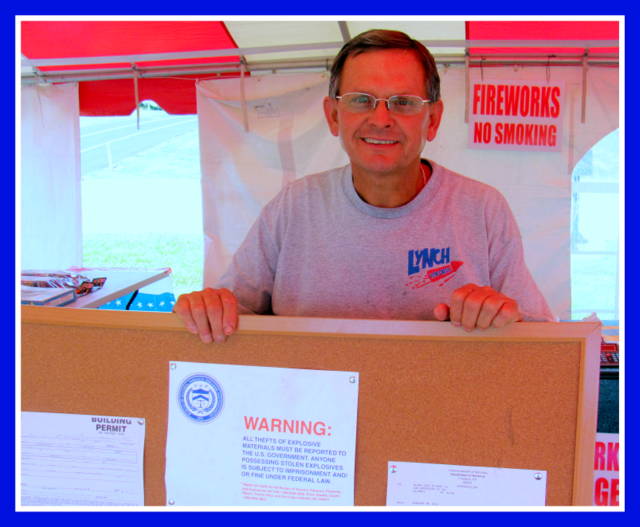 2012-06-17 - 2373 Campbellsville Road, Columbia, KY - Photo by Ed Waggener. Ken Mooney, owner of Things That Go Bang, in the big tent next in the northside parking lot of Adair Gun & Pawn on Campbellsville Road, next to Betty's OK Country Cooking, Columbia, KY, shows just a few of the permits and licenses needed to sell fireworks. He's a commercial pilot, so he's used to red tape, and has found there's lots in this business, too. He got into the business after years of using fireworks to entertain at parties at his farm north of the Pelham Branch Road, Cane Valley Mill Crossroads. He's planning another this year, a few days before the Fourth of July. Things That Go Bang opened June 10, and will be open every day, through July 4th, from 10am until dark with a big line of heavily discounted fireworks.