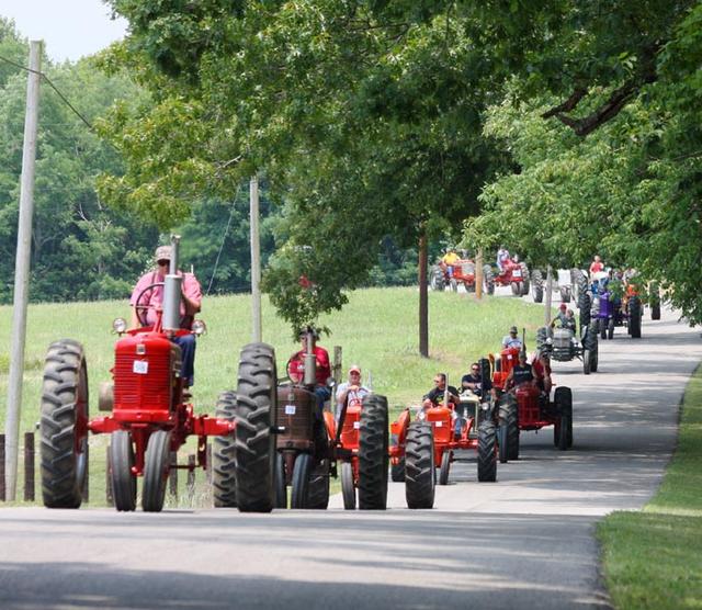2012-06-17 - Homeplace on Green River - Photo by George Kolbenschlag. The Parade Eighteen of the more than 40 tractors at the 16th Annual tractor show held at Homeplace on Green River Saturday participated in a long parade from Homeplace through Tebbs Bend and over the Green River Dam Saturday. - George Kolbenschlag