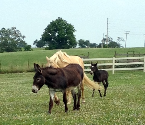 2012-06-17 - Goldenrod Lane, Columbia, KY - Photo by Junior Stotts. Stan the Man, foreground, is one of Adair County's most famous fathers. He is the sire of the little black female mule trailing, and - a rarity in the equine world - a twin sister. They're at home on the Jr. Stotts Ranch, which lies in between some of the best farm advisors in the world's places: Miz Victoria and Miz Gertrude, Jimmy Woody, J.C. Lasley, and Dorothy Shelley. A good father, Stan the Man only succumbs every once in a while to the wiles and temptations of the other lady horses who constantly flirt with him.