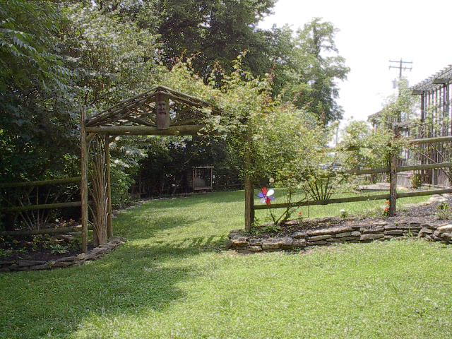 2012-06-17 - Greensburg, KY - Photo by Joe & Peggy Jones. The Heritage Garden at the end of old Stone Row just off the Greensburg, KY, Square. The wooden entrance and carvings are the work of multi-talented Warren Wolfe. - Diane Hall