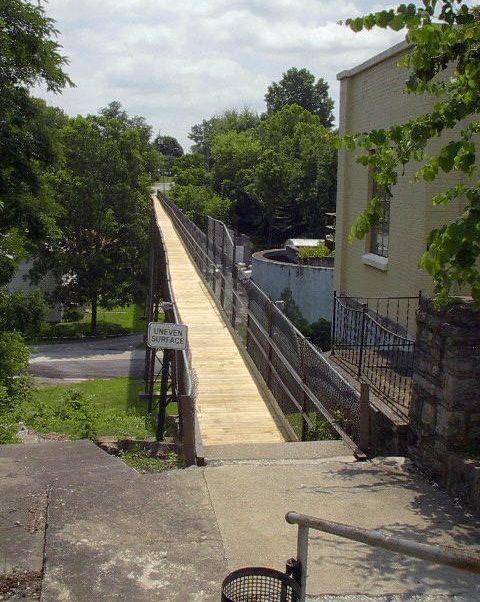 2012-06-17 - Greensburg, KY - Photo by Joe & Peggy Jones. Historic Bridge, 84 years old, resurfaced: Work has been completed on the Goose Creek Footbridge in Greensburg, KY. The bridge was built in 1928 and is 40 feet high at its highest point and 445 feet long with a wooden plank walkway 5 feet wide. - Diane Hall