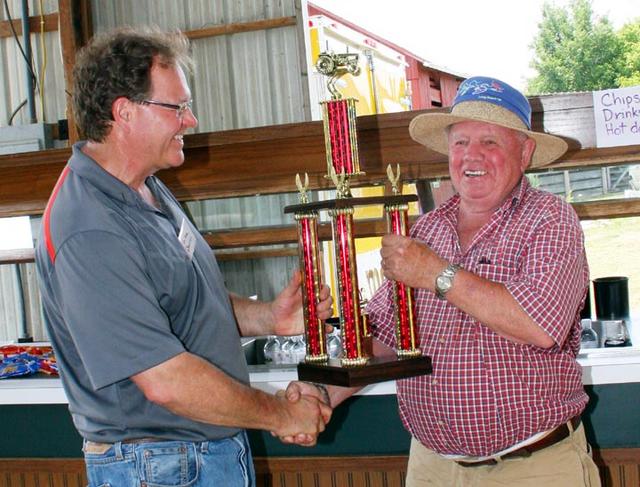 2012-06-17 - Homeplace on Green River - Photo by George Kolbenschlag. Founder Lewis Garrison recognized Adair County contractor and host of the show for the past 15 years was awarded the People's Choice trophy both for the tractors he brought to the show and his long history as host of the very popular event. He asked Homeplace to host the show this year. Awarding the trophy to Lewis is Dr. Max Downey, member of the Homeplace Board of Directors Executive Committee. - George Kolbenschlag