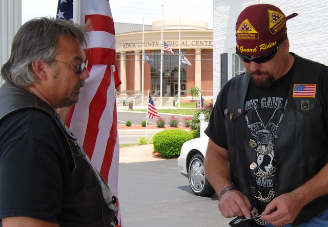 2011-05-28 - Grissom Martin Funeral Home - Photo by Ed Waggener. Patriot Guard Rider Daniel Hayes, Campbellsville, KY left, went over some last minute details with Senior Ride Captain Shawn O'Keefe before the funeral for Seth A. Akin. Hayes, owner of Purcell's Office Supply in Campbellsville, was one of four Taylor Countians riding today. The others were Phil Davis, Barbara Davis, and Joe Robinson.
