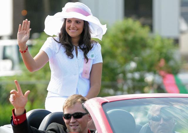 2011-05-29 - Pineville, Bell Co., KY - Photo by Duane Bonifer. LWC photo. Lindsey Wilson College education senior Elizabeth Goode of Somerset, KY, waves to well-wishers during Saturday morning's Kentucky Mountain Laurel Festival parade through downtown Pineville. She was escorted by fellow LWC student Seth Edmunds of Glasgow, KY.