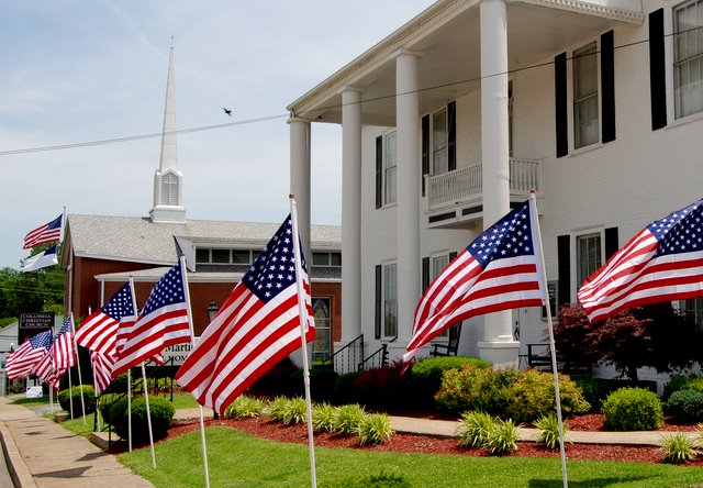 2011-05-28 - 200 Campbellsville ST, Columbia, KY - Photo by Ed Waggener. Campbellsville Street was ablaze with Red, White and Blue today for the 1pmCT funeral of Seth Akin at Grissom-Martin Funeral Home. The Flag Line was just part of the 30 flags posted by the Patriot Guard Riders to honor the memory of a comrade in arms.