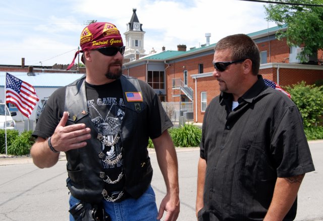 2011-05-28 - Grissom Martin Funeral Home - Photo by Ed Waggener. Patriot Guard Rider Daniel Hayes, Campbellsville, KY left, went over some last minute details with Senior Ride Captain Shawn O'Keefe before the funeral for Seth A. Akin. Hayes, owner of Purcell's Office Supply in Campbellsville, was one of four Taylor Countians riding today. The others were Phil Davis, Barbara Davis, and Joe Robinson.