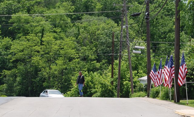 2011-05-28 - Reed ST, Columbia, KY - Photo by Ed Waggener. Patriot Guard Rider Joe Hare of Columbia, KY was the solitary figure on Reed Street after helping to arrange the flag line on Reed Street. Hare, a Black Lion veteran of the Vietnam War, was one of three members from Columbia, besides his wife, Pat Hare, and C.R. Drake.
