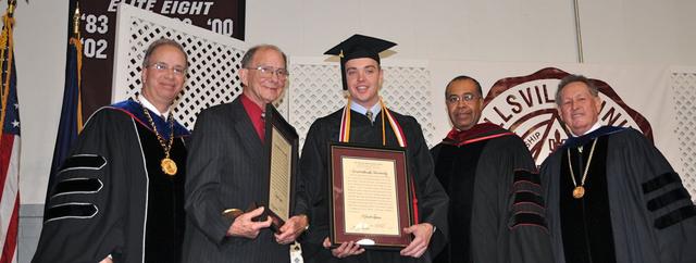 2011-05-27 - Campbellsville, KY - Photo by Joan C. McKinney. Receiving the Algernon Sydney Sullivan Awards from Campbellsville University were, second from left, Dr. James Jones of Campbellsville and Micah Spicer of Wingo, KY. Making the presentation were, from left: Dr. Michael V. Carter, president; Dr. Joe Owens, vice chair of the CU Board of Trustees, and Dr. Frank Cheatham, vice president for academic affairs.