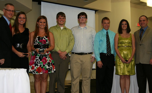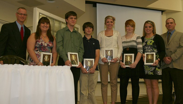 2011-05-26 - Columbia, KY - Photo by Doyle Lloyd. Senior Adair County Band Students were presented with Leadership Awards at the Adair County Band Banquet as follows: Heather Powell, Jessica Hadley, Aaron Bradshaw, Luke Maupin, Tanner Caldwell, Charlotte Murrell. The awards were presented by Tom Case, director, and Matt Emerson, Assistant Director on May 17th, Cranmer Dining Center, LWC.