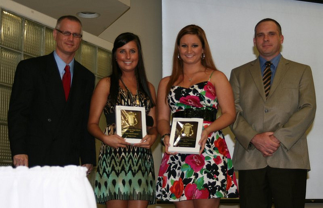 2011-05-26 - Columbia, KY - Photo by Doyle Lloyd. The following students were presented with Outstanding Musican Awards at the Adair County Band Banquet, held May 17th, at the Cranmer Dining Center, LWC: Brandi Moore, Jake Leibeck, Jared Giles, Hayley Knifley, Hunter Rich, and Erin Burris. Shown presenting the awards are Tom Case, Director, and Matt Emerson, Assistant Director.