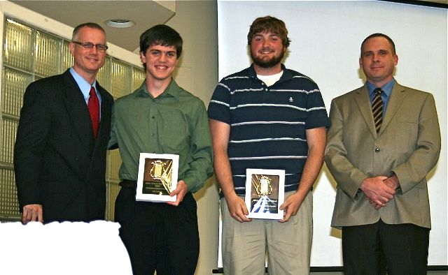 Percussion Section Leaders: Seniors, Jake Leibeck, second from left and Zach Mann, were recognized for their service as percussion section leaders at the Adair County band banquet, held May 17th, Cranmer Dining Center, Lindsey Wilson College, Columbia, KY. Shown presenting the awards are Tom Case, left Director, and Matt Emerson, Assistant Director. right. Seen in the ColumbiaMagazine group on Flickr.