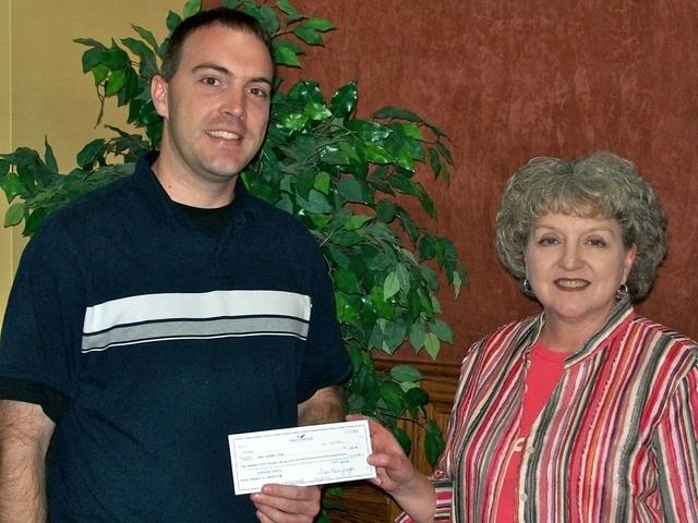 2011-05-25 - Columbia, KY - Photo by Jennifer Myers. Ann Martin, right, President of First & Farmers Bank, Columbia, KY, presents check to Adair County Academic Team Coach Brett Reliford.