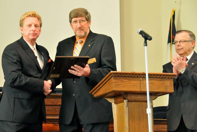 2010-11-17 - Photo by Linda Waggener. Campbellsville University photo. 201 Greensburg ST, Columbia, KY The Rev. Wilburn Bonta, center, Russell Creak Baptist Association director of missions, presented a certificate of recognition to the Columbia Baptist Church transition pastor Dr. Ted Taylor, left, for 'a year of record financial giving (including missions support), worship attendance, and number of baptisms, for the year of 2009-2010.' Taylor, now in his 17th year as a CU School of Theology professor, and in his second year as transitional pastor at Columbia Baptist Church, received the certificate during Campbellsville University Day at the CBC Sunday, November 14, 2010. At right is Rev. John Chowning, CU vice president for church and external relations and executive assistant to president Dr. Michael V. Carter, who spoke at the 10:30 a.m. service. Both Carter and Chowning thanked the CBC congregation for all it has done to support CU. (Campbellsville University Photo by Linda Waggener).