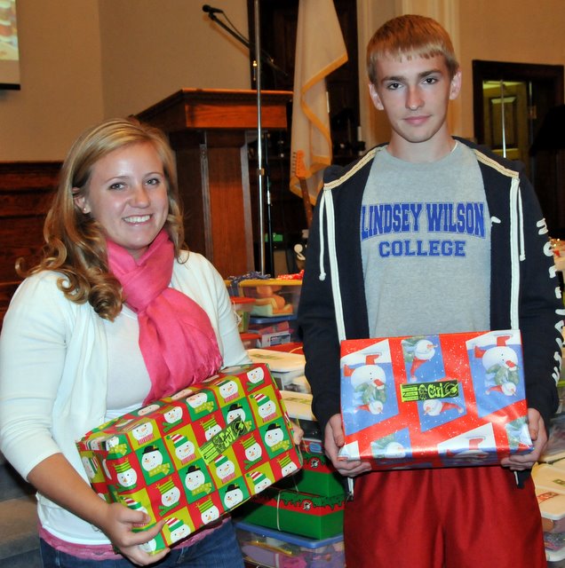 2010-11-14 - Photo by Linda Waggener. CU photo.. 201 Greensburg ST, Columbia, KY Operation Christmas Child was kicked off at the Columbia Baptist Church, Sunday night, November 14, 2010, with the blessing of the gift boxes. The church is paying for postage to ship all of the boxes from both Campbellsville University and Lindsey Wilson College. Leslie Carver, Alexandria, KY, represented CU and Fred Warren, Columbia, KY, represented Lindsey Wilson College.