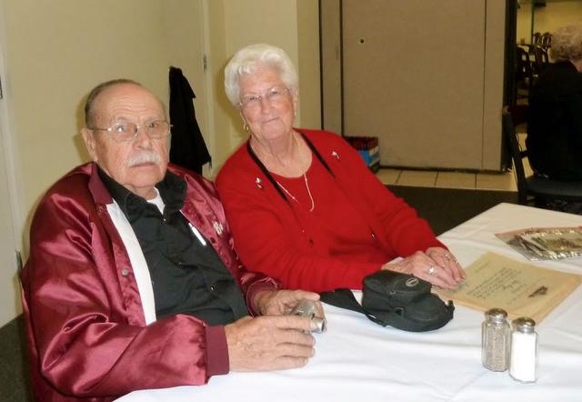 2010-11-14 - Photo by Annette Waggener Richards. Cranmer Dining Center, 430 Helen Flatt DR, Columbia, KY Covered Wagon Club members: "Cora Nell Biggs Cook and her husband, Joseph "Buster" Cook reported the most unusual hobby," writes Annette Richards with the photo taken at the November 5, 2010 reunion of Adair County High School Class of 1955. "They have been members of the Kentucky Trailblazers Horse and Covered Wagon Club since 1982. Once, after a 17-day trip over the mountains, the club members' covered wagons inaugurated traffic through the Cumberland Gap Tunnel. Their photos are awesome, especially the one of their covered wagon, pulling a color-coordinated porta potty."