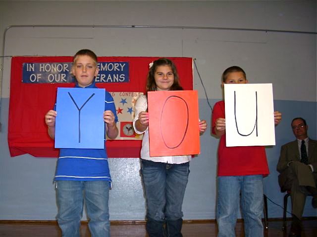 2010-11-12 - Photo by Jennifer Mann. John Adair Intermediate School, 202 Gen. John Adair DR, Columbia, KY John Adair sudents, Sam Baker Emily Pyles, and Blake Biggs, spell out 'YOU' to follow 'THANKS' at the John Adair Intermediate School Veterans Day program.