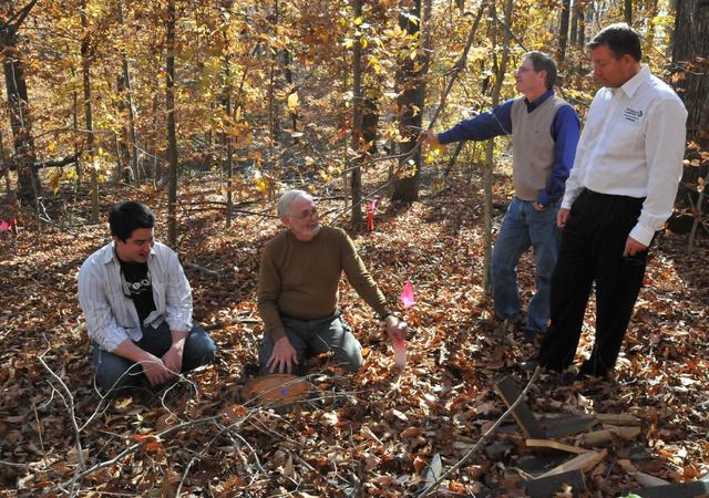 2010-11-12 - Photo by Christina Miller, CU. Clay Hill Memorial Forest, Campbellsville, KY Campbellsville University's director of Clay Hill Memorial Forest, Dr. Gordon Weddle, second from left, shows Ben Lowe, far left author and founder of Renewal, a student-led program on creation care organization; Dr. Richie Kessler, third from left CU's associate professor of biology and environmental studies coordinator, and Terry Cook, director of The Nature Conservancy, the many aspects of the forest. Kessler is a former employee of The Nature Conservancy. Lowe and Cook spoke at Campbellsville University on earth stewardship.