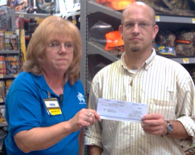 2010-11-12 - Photo submitted by Adair Co. 911 Center. Walmart, 2988 Burkesville RD, Columbia, KYThe Adair County 911 Center received a $500.00 grant from the Columbia Wal-Mart. The money was used to help purchase computer equipment that will replace an older computer which is used to access information for local law enforcement. Vickie Petty from Wal-mart is pictured presenting Justin Bailey of the Adair County 911 Center the check.
