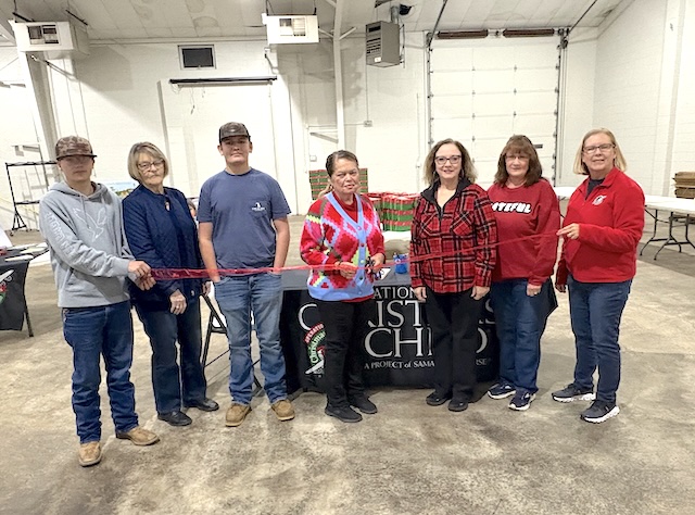 2025-11-17 - Columbia, KY - Photo from Mark Fudge. Mayor Pam Hoots did the honors of cutting the ribbon for the opening of the 2025 OCC drop off campaign. November 17-24 has been designated worldwide as national collection week for OCC shoebox gifts.