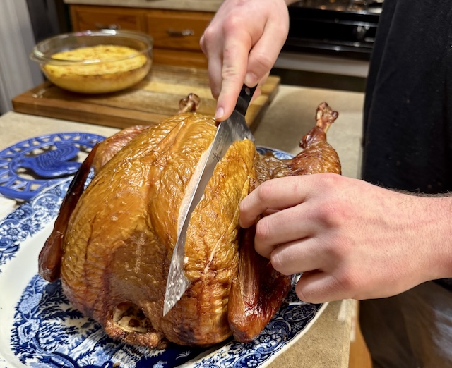2025-11-30 - Edmonton, KY - Photo by Linda Waggener, ColumbiaMagazine.com. This turkey was smoked and carved by chef Will White for family and friends Wednesday before he returned to work at Walmart in time for preparation for heavy holiday shopping. Turkey was yummy thanks to his careful cooking. All the side dishes included traditional ones given to us by Geniece Marcum. - LW