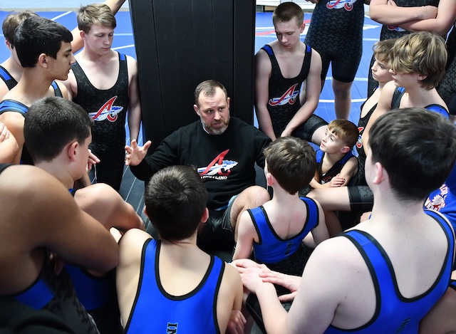 2026-01-16 - Columbia, KY - Photo courtesy Lindsey Wilson University. Lindsey Wilson University Assistant Dean of Students Abe Cross speaks to members of Adair County Public Schools' wrestling program during a recent practice at Adair County Middle School.