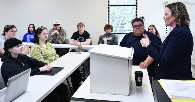 2026-03-24 - Columbia, KY - Photo courtesy Lindsey Wilson University. Lindsey Wilson University alumnus Kyle Edwards '06 speaks to students in one of business professor Cathy Boatright's classes on Monday, March 23, 2026, in the university's J.L. Turner Leadership Center. Edwards, who is president of Edwards Managed Technology Computer Consulting of Lexington, Kentucky, was visiting his alma mater as a member of the LWU School of Business and Communication Advisory Board.