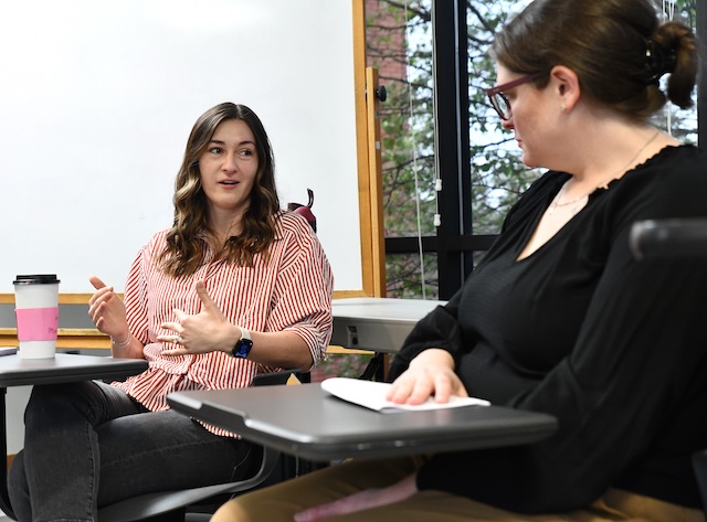 2026-03-24 - Columbia, KY - Photo courtesy Lindsey Wilson University. Lindsey Wilson University alumna Madison Bryant Kirby '19 answers a question from communication professor Jennifer Furkin '06 during one of Furkin's classes on Monday, March 23, 2026, in the university's J.L. Turner Leadership Center. Kirby, who is a digital learning executive at Wiley Publishing, was visiting her alma mater as a member of the LWU School of Business and Communication Advisory Board.
