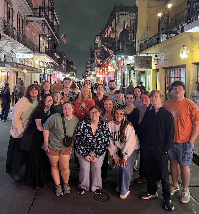 2026-04-02 - New Orleans, LA - Photo courtesy Lindsey Wilson University. Members of the Lindsey Wilson University delegation to the 2026 Sigma Tau Delta Convention in New Orleans gather in the city's iconic French Quarter District. A total of 19 Lindsey Wilson students and three English faculty attended the meeting; seven Lindsey Wilson students presented research or original creative work.