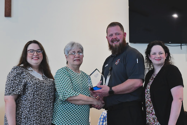 2026-04-14 - Columbia, KY - Photo by Duane Bonifer. Neil Thornbury, CEO T.J. Regional Health, center, spoke as he presented the Spirit of Columbia awards to these two servants. He said, "In June of 2025, Critical Care Paramedic Cody Neat and others arrived on the scene of a vehicle versus a combine accident near the Breeding community. A victim was trapped in his vehicle that had collided with a combine. Thinking outside the box, Cody Neat had the idea to contact T.J. Health Columbia to see if blood could be transported to the scene. Shelby Hatcher took the call, which was highly unusual, and she immediately escalated the situation to the Chief Medical Officer in the Emergency Department and to Hospital Administration and the Lab. Everyone agreed that this course of action was appropriate and Shelby personally delivered the blood to the scene with an escort from local law enforcement. The quick thinking by Cody, the efforts of Shelby, and the collaboration between all departments involved saved the victim's life."