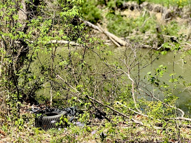 2026-04-14 - Adair County, KY - Photo by Linda Waggener, ColumbiaMagazine.com. It's good we have a Fiscal Court that keeps the recycling center open as a priority. We have cleanup days ahead this spring for items like the tire amongst the Wild Sweet William blossoms.