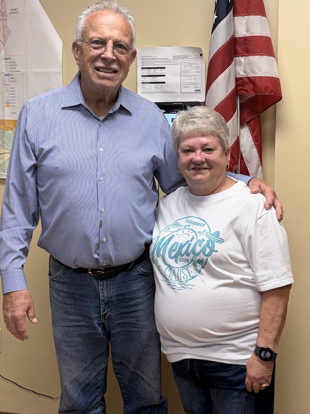 2026-04-17 - Columbia, KY - Photo courtesy Bridget Compton. Judge Larry Russell Bryant joins Fredia Melton, who has been a 911 dispatcher for close to 20 years, at the signing of the proclamation for Public Safety Telecommunications Week in Adair County.