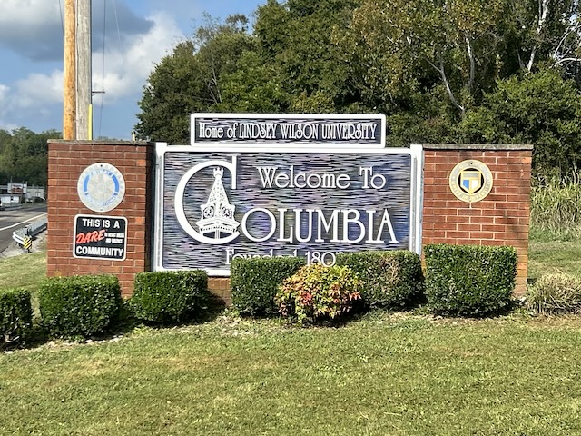 2025-09-26 - Columbia, KY - Photo from Trey Stephens. The City of Columbia is placing new "Welcome to Columbia" signs on roadways that enter the city, to include"Home of Lindsey Wilson University." Two new signs can be seen on Hwy East 80 and Jamestown Street.