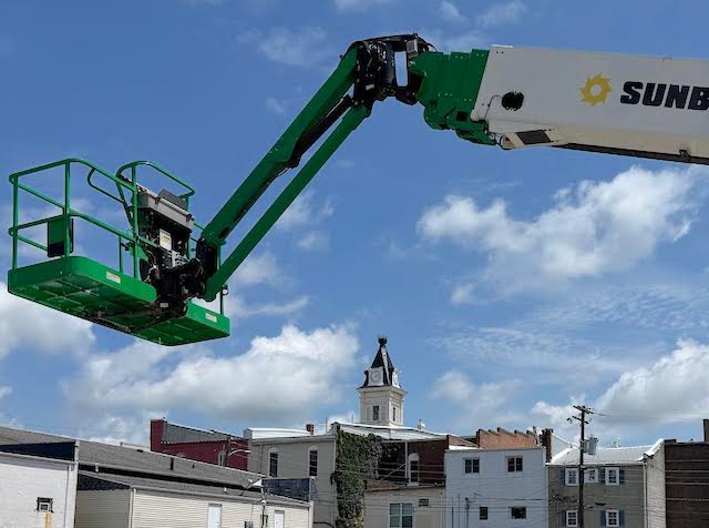 The big boom that helped get workers up to the top of the historic Adair County Courthouse clock tower last week is now parked in the City parking lot off Burkesville Street. The signs indicating one-lane traffic have been removed from the Square.