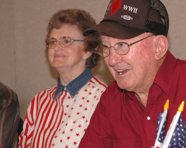 2005-11-14 - Lindsey Wilson College, Columbia, KY - Photo LWC Staff. World War II Army veteran Milton Stephens of Columbia chats with friends during the lunch. Stephens, who was awarded two Purple Hearts, was a staff sergeant for 38 months in the European Theater. Shirley Dudley, Columbia, KY, is seated next to Milton Stephens.