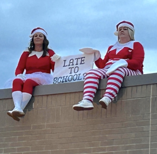 2025-12-22 - Taylor County, KY - Photo from Bill Collins. Taylor County High School had two visitors welcoming students this week - elfs on the shelf... actually elfs on the rooftop. They are Councilors Candice Gilpin and Shea White, Bill's daughter and Collin White's mom.