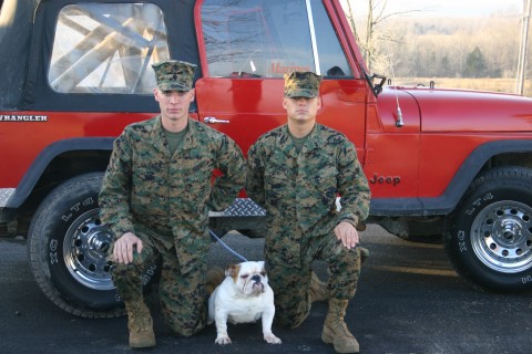 2005-12-24 - Columbia - Photo courtesy of the family. Pvt. Kristopher Knight and Pvt. Brandon Hackney are enjoying some much anticipated time at home. Both graduated from Marine Corps bootcamp at Parris Island, South Carolina December 16th. They will be leaving for more training January 17th. They are pictured here with Kristopher's bulldog "Opha Mae" who is named after the first female Marine, Opha Mae Johnson.(Family news photo contributed by very proud mom, Melissa. melissa1222@alltel.net)