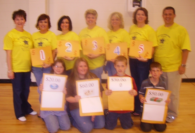 Taking part in the Deal or No Deal CATS test rally fun at Adair County Elementary School on Friday, April 18, 2008, were teacher models Sandra Wilson, Mary Keen, Missy Garmon, Pam Cundiff, Beth Ellison, Debbie Cowan, and host Robbie Harmon, Contestant winners were Nicole Burton, Amber Phillips, Alex Bradshaw, and Levi Hausdorfer. Amber Phillips was the big winner.