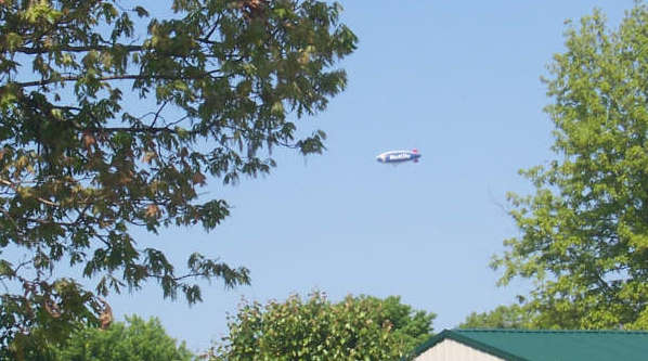 SANDRA VAN ARSDALE an old veteran at blimp spotting--she and her parents saw this same one over the Watterson Expressway in St. Matthews yesteday (Sunday) morning--got this shot of the blimp making its way over the White Oak Community in Adair County. You can see the writing on on the blimp, spelling out MetLife. A nigh as anyone can tell so far, the blimp was on its way from the Derby in Louisville to Duluth, GA and is the Snoopy 2. However, ColumbiaMagazine.com welcomes more reliable information on the subject.