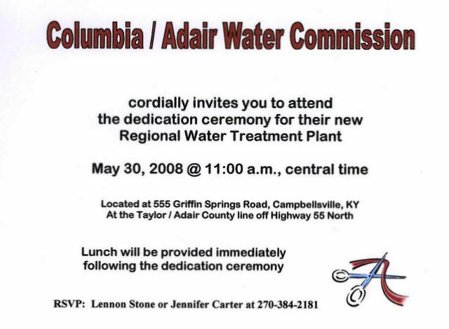 Invitation to dedication ceremony for water treatment plant