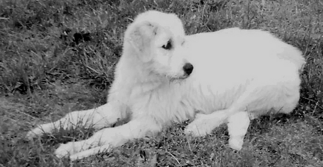 UPDATE 2008-05-17: The dog's gone, no longer availableThis very adorable, very large puppy appeared at our home on Holmes Bend Road in the Happy Hollow area on Tuesday night, May 13, 2008. She's a white female with beautiful grey eyes. She looks like a mixed breed, maybe has some kind of retriever in her? She's very playful and seems to be very loving, too. If she's not claimed this week, we're going to take her to the animal shelter. Please call us at (270) 384-7823. ANIMALS