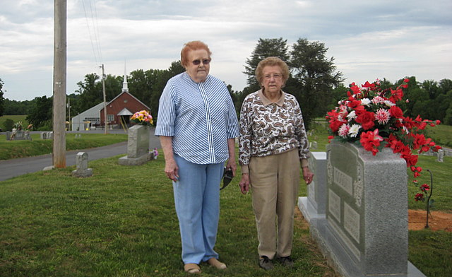 GLADYS McQUAIDE and sister BERTHA GOODIN were at the Bearwallow Cemetery on Thursday, May 22, 2008, two of several families who have already started paying homage to family members passed on. They see to the graves of their mother and father and of Mrs. McQuaide's late husband, Harry McQuaide as well as other relatives. Both have attended services at the church since it was a United Brethren in Christ congregation, before the denominational merger made it a United Methodist Church. The sisters operated a Goodin's Rest Home at Christine for many years, until a tornado severely damaged it. Gladys McQuaide later owned and operated the Montgomery Ward Store in Columbia and Bertha Goodin continued her career with retired people needing care, working for seven years at Summit Manor in Columbia. The cemetery will be one of the busiest locations in Adair County during the holiday weekend.