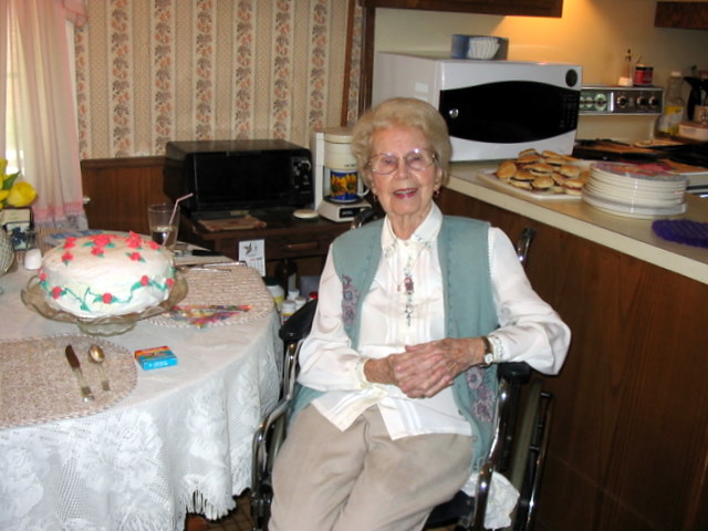 EFFIE HESKAMP is awaiting the arrival of guests for her 98th birthday celebration on Saturday, May 17, 2008. Family and friends came for lunch and enjoyed, among other delicious foods, a birthday cake baked by Virginia Gadberry.